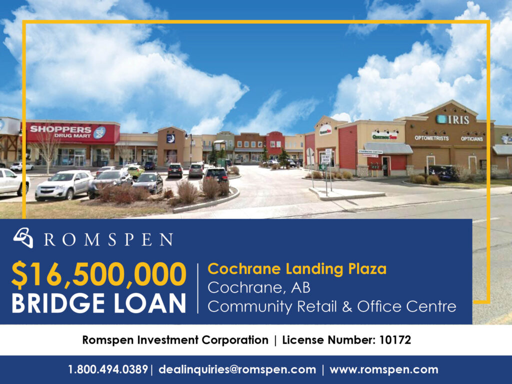 We are pleased to announce the successful financing of a $16.5 million bridge loan secured by Cochrane Landing, a well-positioned retail and office centre anchored by Shoppers Drug Mart, CIBC, and Starbucks.
